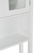 - Features two (2) doors with two (2) adjustable interior shelves and one (1) open bottom shelf. Brushed nickel hardware