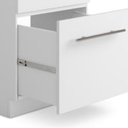 - Cabinet is constructed with melamine and drawer front is wrapped with PVC, materials that are highly durable, low maintenance, and water resistant