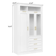 - Versatile Storage System: Combines 3 drawers, 2 hanging zones, and one enclosed cabinet with glass and wooden doors for customizable storage options.
