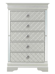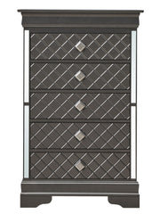- Embossed "X" Design: Silver Champagne embossed "X" design on wood veneers for a stylish bedroom group highlight.