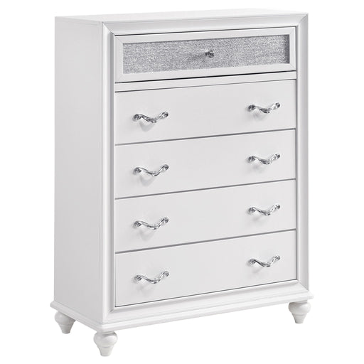 Elegant 5-drawer design in pearl white finish offers timeless style and ample storage space Diamond trim on drawer fronts adds visual depth and di...