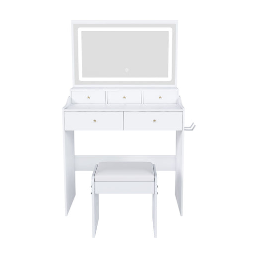 View full detailsLED Vanity Mirror With Stool, 2 Drawers & 5 Storage Cabinets, Adjustable Lighting Mdf Dressing Table For Bedroom - White