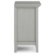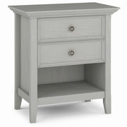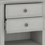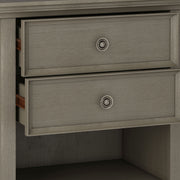 - Features two (2) spacious drawers with metal drawer glides and open bottom storage area