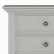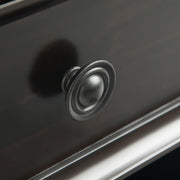 - Traditional design includes tapered legs, molded crown edged table top, panel framed drawer fronts and bronze round decorative pulls