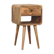 - Mini Curve Lower Nightstand - The mini version of our famous IN308, this small but handy bedside makes a perfect stand for nibbles, drinks, or a lamp. It will prove handy all over your home and is made from 100% solid mango wood in a fine finish. It has curved edges which will fit into any home/living space. It also comes with 1 drawer, 1 lower open slot and 4 Nordic style legs. This petite product is part of Recession Collection.