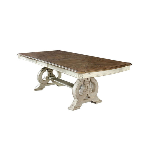 Farmhouse-inspired two-tone finish adds rustic charm and visual depth to any dining room Expandable table features an 18-inch leaf with smooth met...