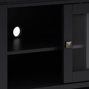 - Features two (2) sliding tempered glass doors that open to a cabinet with two (2) adjustable shelves