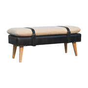 - Boucle Buffalo Hide Leather Bench - Derived from the French word for curled or ringed yarn or fabric. This handwoven upholstered furniture piece is made of 100% cotton and natural yarn, featuring buffalo hide leather to create a beautiful fusion of colours and materials. It has a belted strap design and also features solid wood legs which have and finish providing strength and durability.