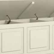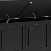 - Features a lift-up lid with child safety hinges that opens to reveal three large storage compartments