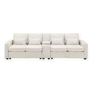 Upholstered Sofa With Console, 2 Cupholders And 2 USB Ports Wired Or Wirelessly Charged, Modern Linen Fabric Couches With 4 Pillows (4 Seat) - Beige