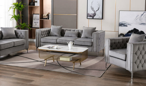 Faux Jeweled Tufted Design: The Raisa Living Room sofa is adorned with a faux jeweled tufted design on its micro suede cover. Handcrafted Nailhe...