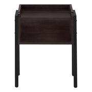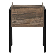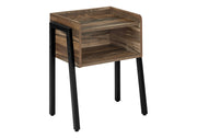 • Design and Finish: This 2-tier accent table features a rectangular shape with a reclaimed wood-look finish. It includes a tray-style tabletop with raised edges on the sides and back, and rounded front edges for added safety and style.