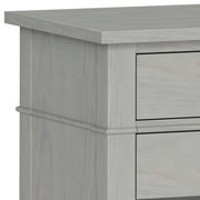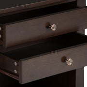 - Transitional design includes defined double molded top, tapered table legs, flat panel drawer fronts and antique bronze rounded decorative handles