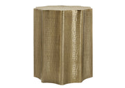 - Design and Finish: This drum table features a stylish scalloped design with a hammered texture, finished in an antique metal. It adds an eye-catching boho glamour to any living room or bedroom setting.
