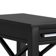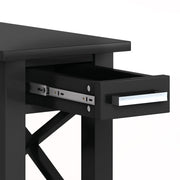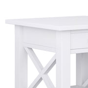 - Features one large drawer with metal drawer glides and an open bottom shelf providing ample storage space.