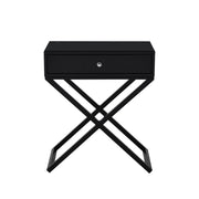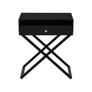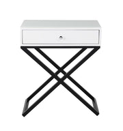 - Organize and declutter with the Koda side table. Place this table as a nightstand to your bed or as an end table in your living room. The one drawer with silver knob provides storage space for your everyday necessities. The finely crafted tabletop works perfectly for your lamp, picture frames, and any other decorative items for display. The MDF tabletop has a tempered glass for a contrasting material. The base is not only designed with an attractive black cross leg, but also solidly built with sturdy metal legs. Available in other colors that will complement your home's specific decor.