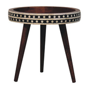 - Small Patterned Nordic Style End Table - This solid wood end table has made from 100% mango wood in a fine finish. The no-fuss finish reveals the beautiful grain of the mango wood which this piece of furniture is made of. This tripod table stands on Nordic style legs and features a and white bone inlay pattern on the edges. The bone is sourced responsibly from deceased animals such as camels, goats, and buffaloes.