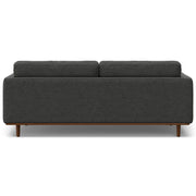 - The generously sized couch for features a single bench cushion with a high-density foam core wrapped in feathers, and loose back cushions and bolster pillows stuffed with a combination of feather and polyester fiber filling for a plush feel.