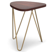 - Features unique shaped solid wood top and gold metal hairpin legs