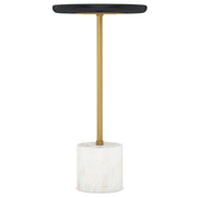 - Features round solid mango wood top, antique brass look stem and solid white marble base