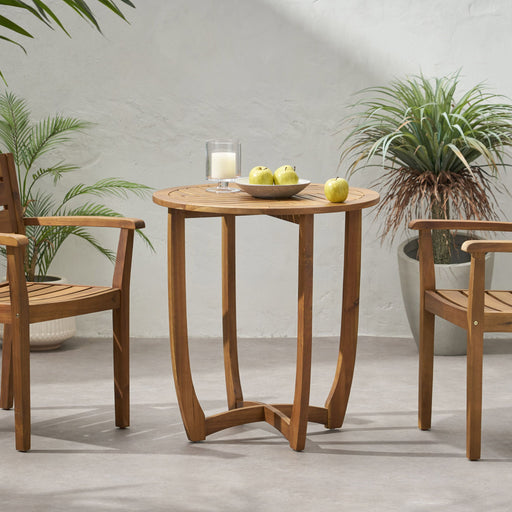 View full detailsOutdoor Circular Wood Bistro Table With Curved Legs And Slat Panel Table Top - Teak
